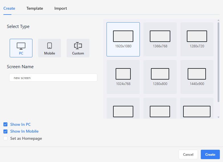 Mobile: Indicates that the screen is designed for mobile devices.PC: Indicates that the screen is designed for desktop or widescreen displays. (Note: These tags are used by the system’s automatic device detection logic at project startup.)