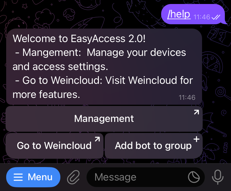 To add the bot, open the menu in the Telegram chat with the bot, type