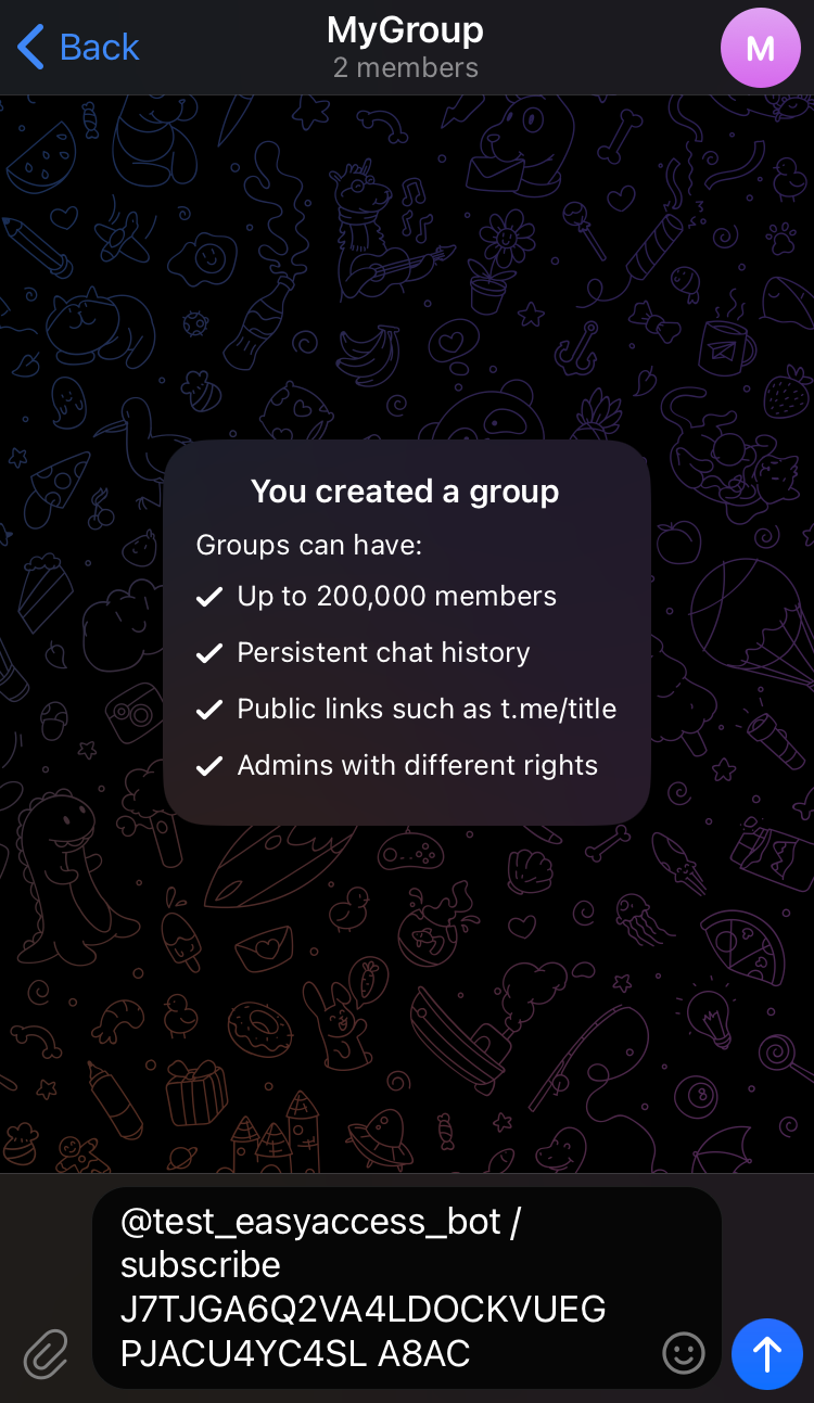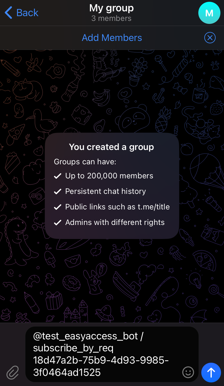 - The command will be auto-filled in the group chat. Send it to complete the subscription.