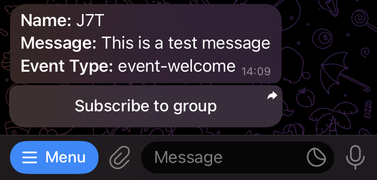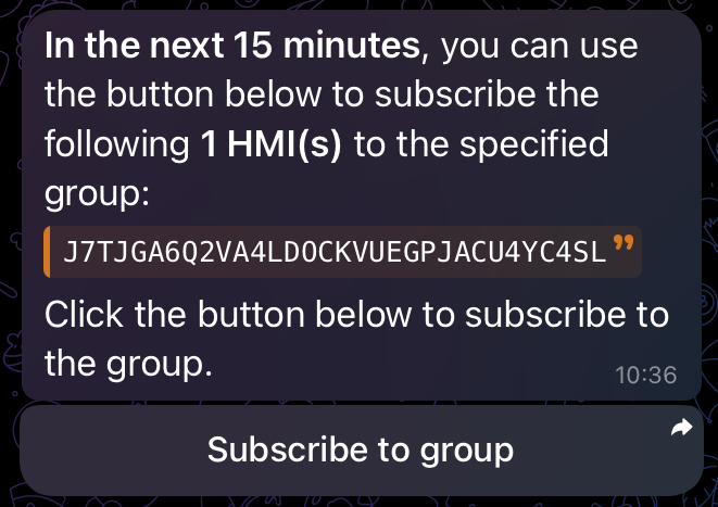 After completing the QR code scan and subscription, the HMI will send a welcome message in the Telegram chat with a subscription button.